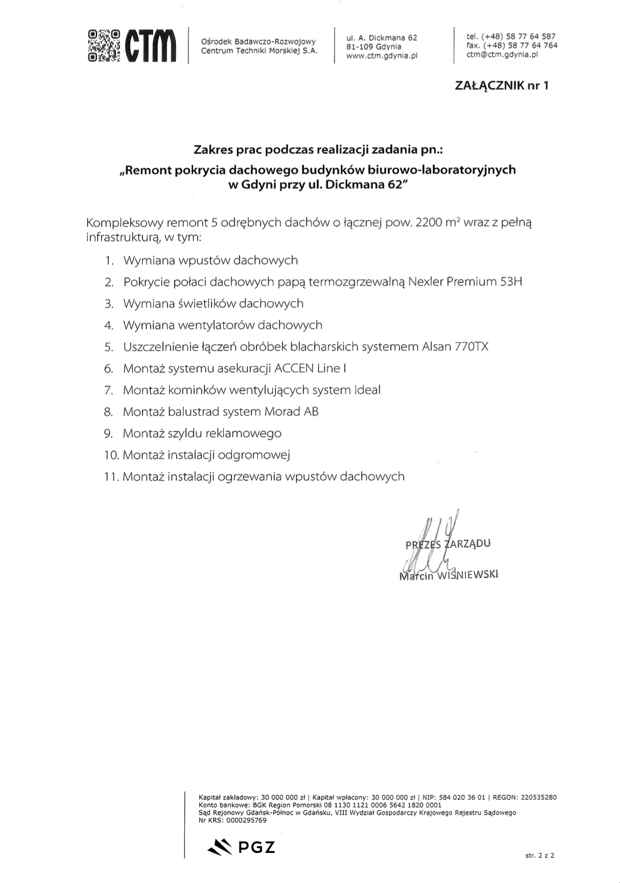 Ośrodek Badawczo-Rozwojowy Centrum Techniki Morskiej S.A. z siedzibą w Gdyni zaświadcza, że remont pokrycia dachowego został wykonany terminowo, zgodnie ze sztuką budowlaną, w oczekiwanym standardzie oraz warunkami umowy.